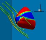 3-D rendition of the Solar System as seen from the outside. It is distorted into bullet shape in the direction of the interstellar magnetic field. The field lines are shown wrapping around the Solar System.