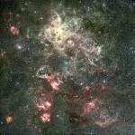 This image was obtained with the FORS1 multi-mode instrument on Eso's Very Large Telescope, its structure is fascinatingly complex, with a large number of bright arcs and apparently dark areas in between. Inside the giant emission nebula lies a cluster of young, massive and hot stars, denoted R 136, whose intense radiation and strong winds make the nebula glow, shaping it into the form of a giant arachnid. The cluster is about 2 to 3 million years old, that is, almost from 'yesterday' in the 13.7 billion year history of the Universe.