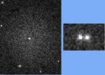 A Hubble Space Telescope image shows a dwarf galaxy, VCC128, at the centre, and the enlargement at right shows a double nucleus that suggests the presence of a black hole. It is only the second time a supermassive black hole has been discerned in a dwarf galaxy, and only the third time that astronomers have observed a double nucleus at the heart of a galaxy. The galaxy, called VCC128, lies in the Virgo Cluster and is about 1 percent the size of the Milky Way. All of its stars combined would equal 100 million to 1 billion of our suns.
